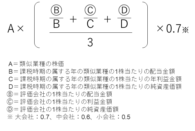類似業種比準価額方式は、評価会社(自社)と同業種の上場会社の株価(類似業種の株価)をベースに、評価会社と類似業種の配当・利益・純資産の3要素を考慮して株価を算定する方法です。