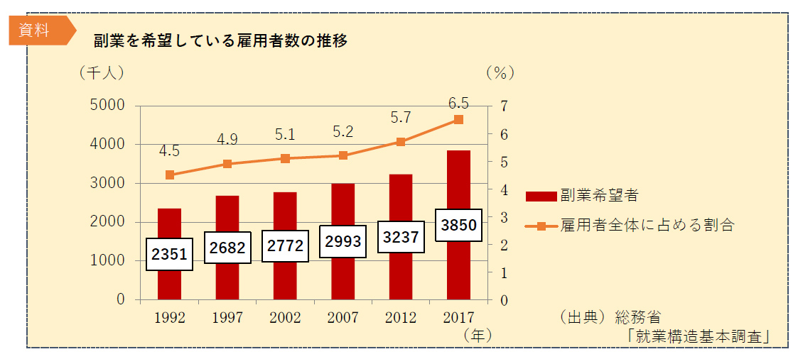 国策を挙げて、副業が推進される時代です。副業解禁も進み、副業に本気で取り組む会社員の方も増えています。総務省による調査によれば、下記のように副業を希望する雇用者は年々増加傾向にあることが分かっています。