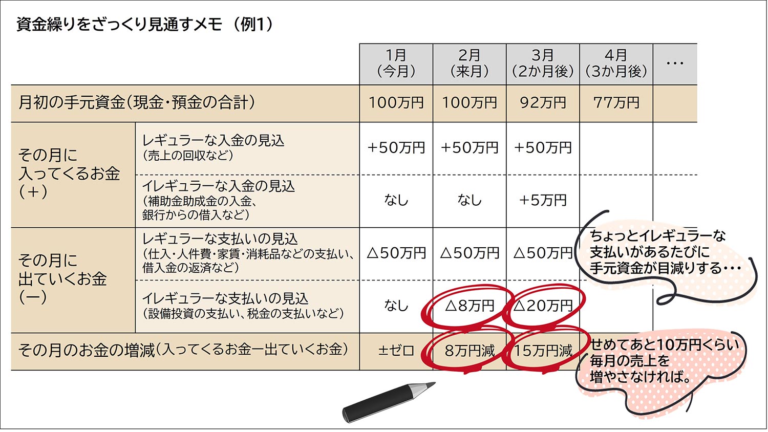 今月分と同じ要領で、翌月分、翌々月分を書き並べていけば、数か月先、半年先の手元資金がどうなっているか見通すことができます。これが、資金繰りをざっくり見通すメモです。