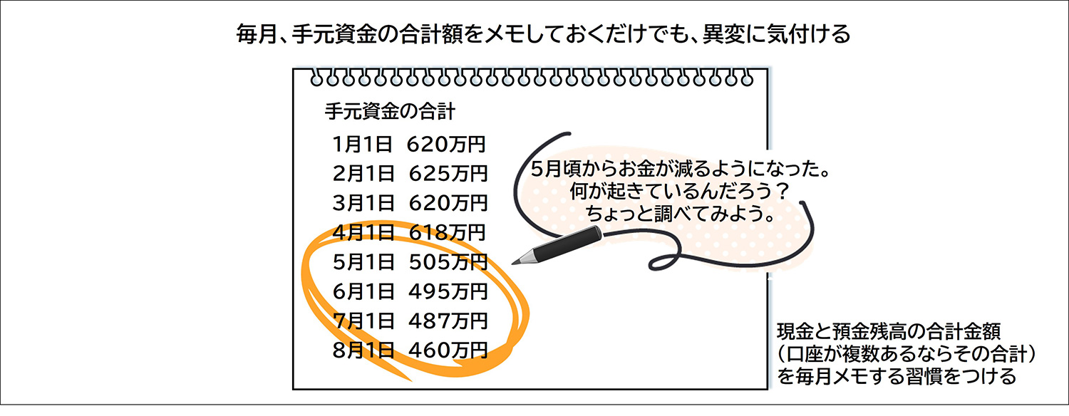 もし前述のようなメモで資金繰りを見通すことが困難であれば、毎月月初に、お手元の手帳に会社のお金の残高をメモする習慣だけでもつけましょう。これだけでも、異変に気付くきっかけになります。