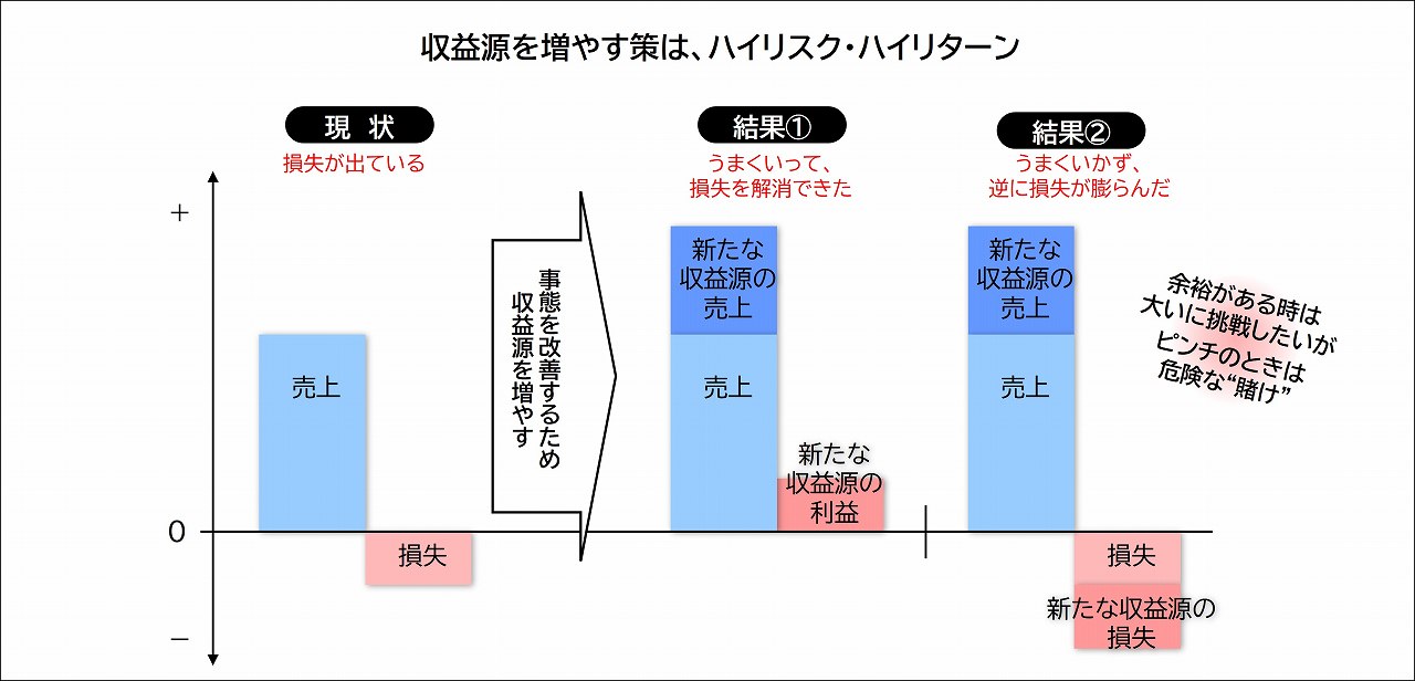 筆 者 「難しいですよね。“収益源を増やす”策は、うまくいけば良いリターンが期待できますが、リスクもあるのが怖いところですね。うまくいく確証がない限り、経営に余裕がないと挑戦しづらいですね。」
