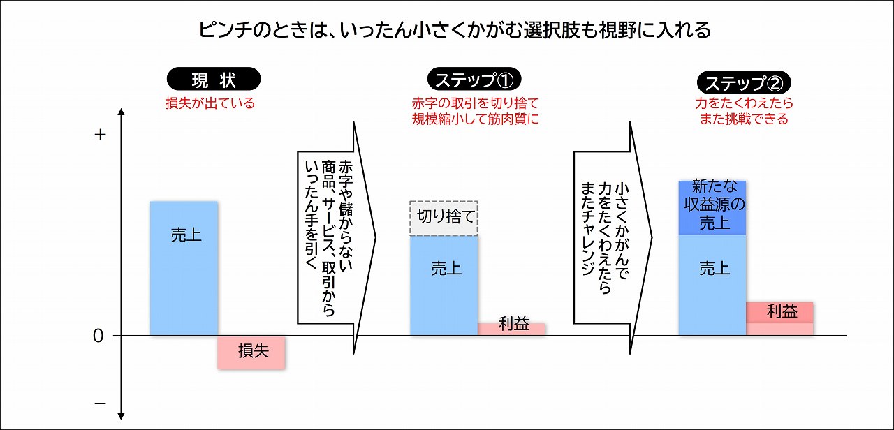 筆 者 「今は資金の余裕がないピンチのときです。こういうときは、考えるべき策がもうひとつあります。“事業の縮小”です。」