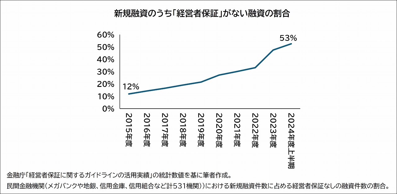 筆 者 「先ほどのグラフの通り、経営者保証なしの融資は2015年の段階では1割しかなくて、ガイドラインがスタートしても実際はなかなか浸透しませんでした。形骸化してしまうのかなあと思われていたところ、2024年度上半期に5割を超えたという統計が発表されて注目を集めたところです。スタートから10年経った今、やっと浸透し始めた印象です。」