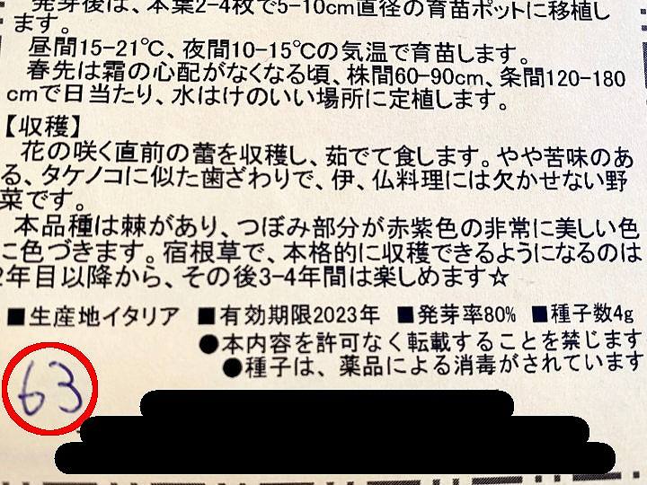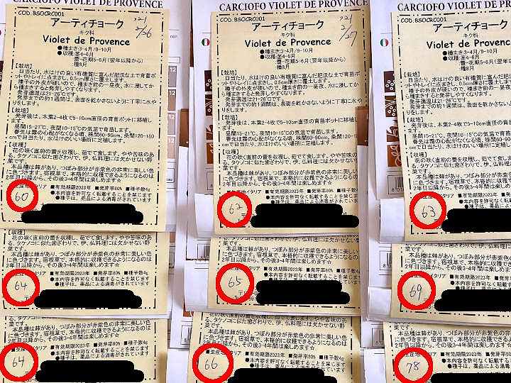 この方法は1年目には通用しませんが、僕は苗を作る際に種の数をカウントしています。それによって、次回からの栽培計画を立てる時にどのくらいの種を購入すればよいかがわかります。数がある程度わかれば、そこに発芽率を掛け、1袋からどのくらい芽がでてくるかを計算することができます。タケイファームが栽培している品種のアーティチョークは、1袋4g入りで、発芽率80パーセントとなっています。9袋分の種まきをした時は、60粒、64粒、64粒、62粒、65粒、66粒、63粒、69粒、78粒とそれぞれ微妙に違いますが、だいたいの数が把握でき次回に向けての大切なデータとなります。