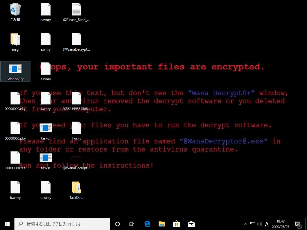 身代金を支払っても元に戻せるとは限りませんし、データが相手の手元にあれば、脅迫のリスクは残ります。企業としては絶対に感染したくないマルウェアと言えるでしょう。マルウェアに感染するとすべてのファイルが暗号化され、脅迫文が表示されます。(画面:筆者撮影)