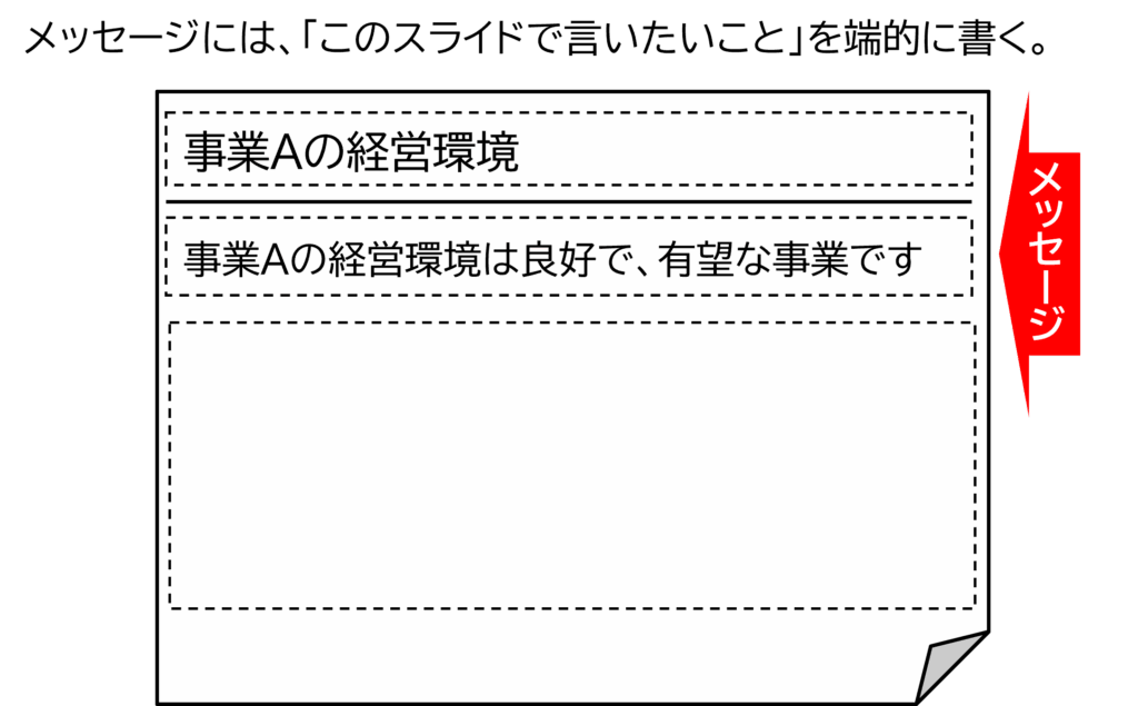 メッセージは省略されがちですが、プレゼンを成功させるためにはきちんと書くべきです。メッセージが書かれていないと、聴き手に「この人はこのページで何を言いたいのだろう?」と考える負担を与えます。プレゼン時に口頭で補うとしても、文字になっていない情報は聴き手の頭に残りませんし、その場にいない人には伝わりません。また、メッセージが書かれていないページでは、書き手自身にも「そのページで何を言いたいか」が分かっていない場合が多いものです。