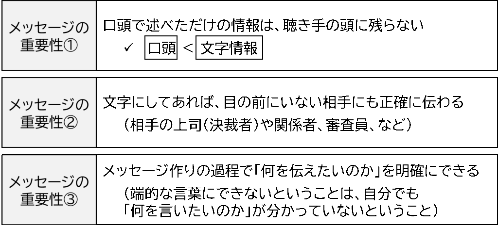 • メッセージ(お題目や問いに対する答え。つまり、そのページで言いたいこと)