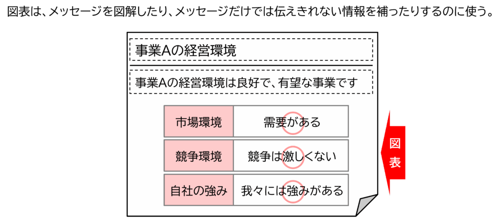 図表は、メッセージを図解したり、メッセージより詳しい情報を補ったりするのに使います。