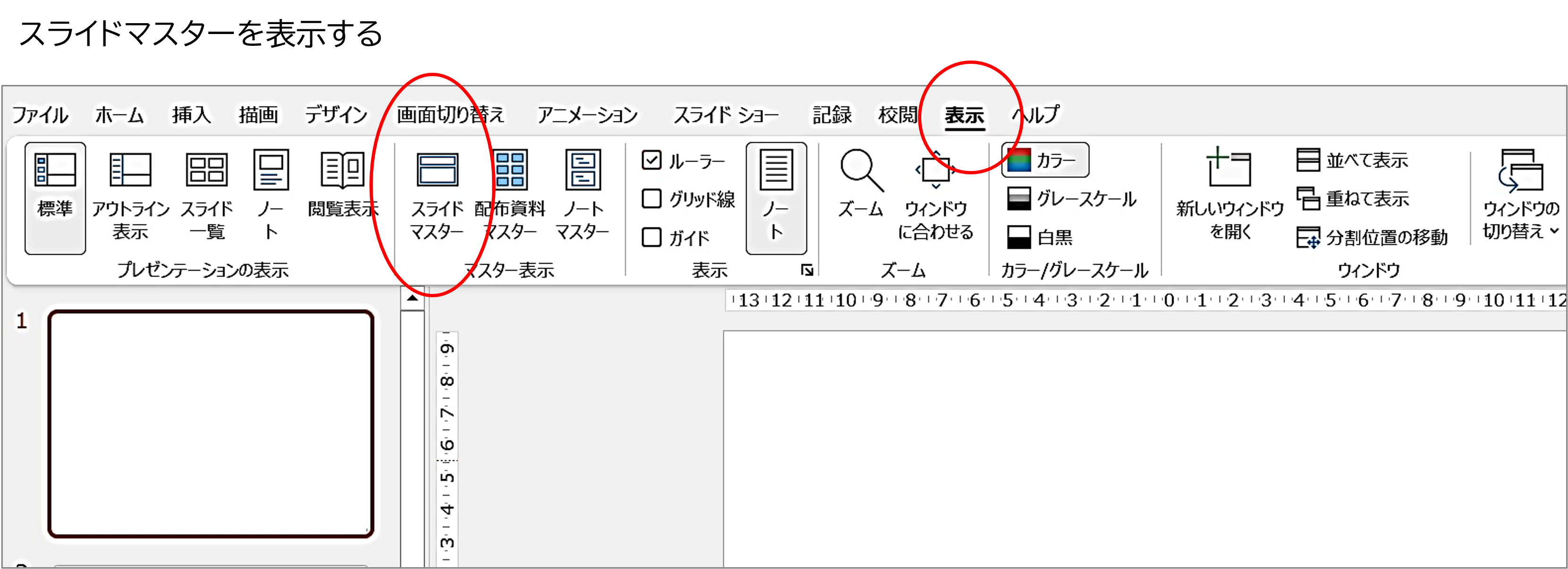 スライドマスターの作成画面を表示するには、「表示」タブの「スライドマスター」をクリックします。