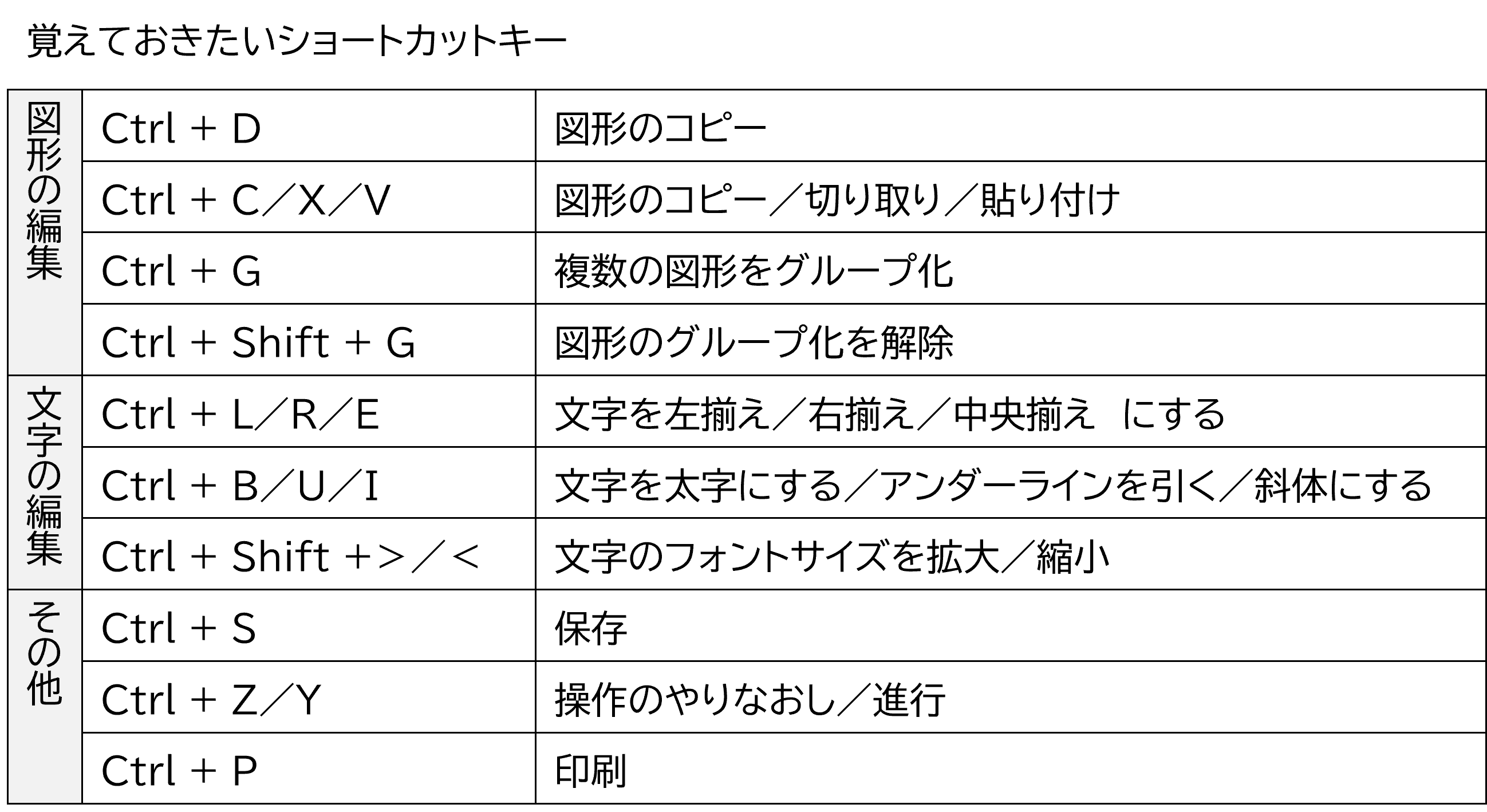 中でも覚えておきたいショートカットキーが、一番上の「Ctrl+D」です。これはパワーポイントの定番ショートカットキーです。図形をコピーするショートカットキーですが、「Ctrl+C」と違って貼り付けの操作(「Ctrl+V」)が不要で、コピー&ペーストが一度の操作で済みます。
