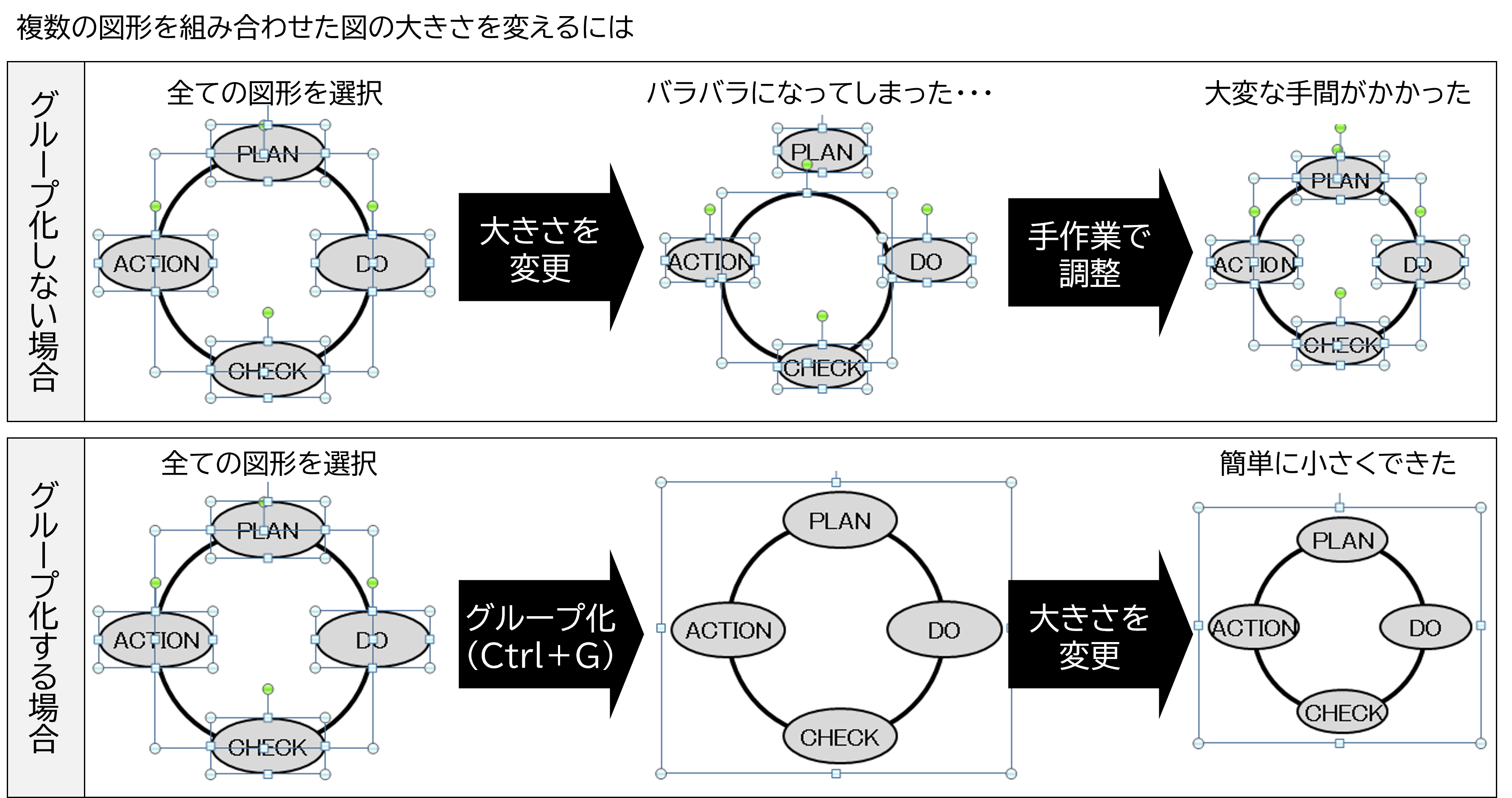 複数の図形を組み合わせて使うときは、図形を「グループ化」をすることで格段に扱いやすくなります。下図に、複数の図形を組み合わせた図の大きさを変える作業を示しました。