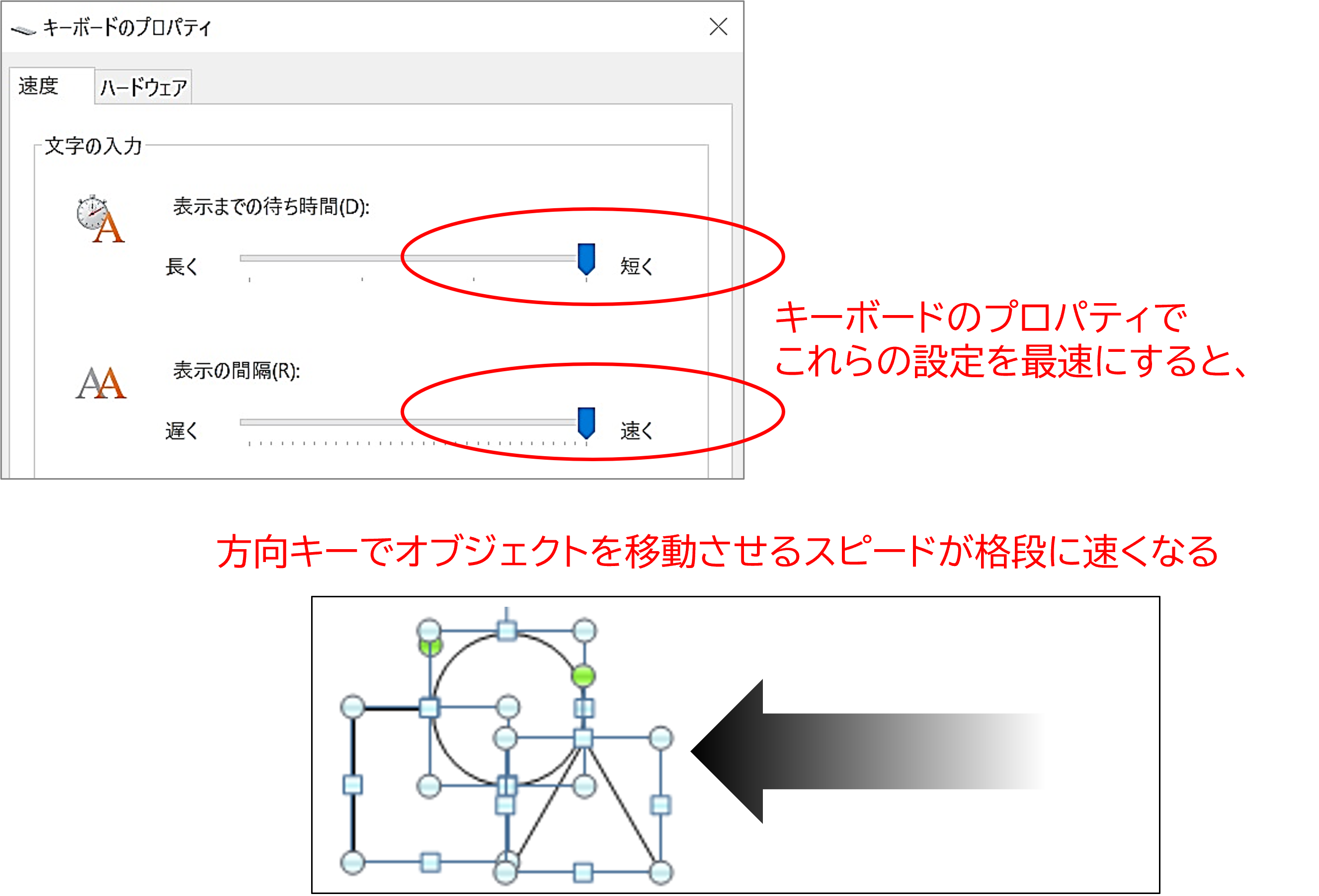 図形やテキストボックスをキーボードの方向キーで動かす際、移動速度が遅いとそれだけで時間を費やします。この移動速度は、「キーボードのプロパティ」でかなり速く設定できます。設定を最速にすれば図形やテキストボックスをスイスイ動かせるようになり、作業が快適になります。ぜひ試してみてください。