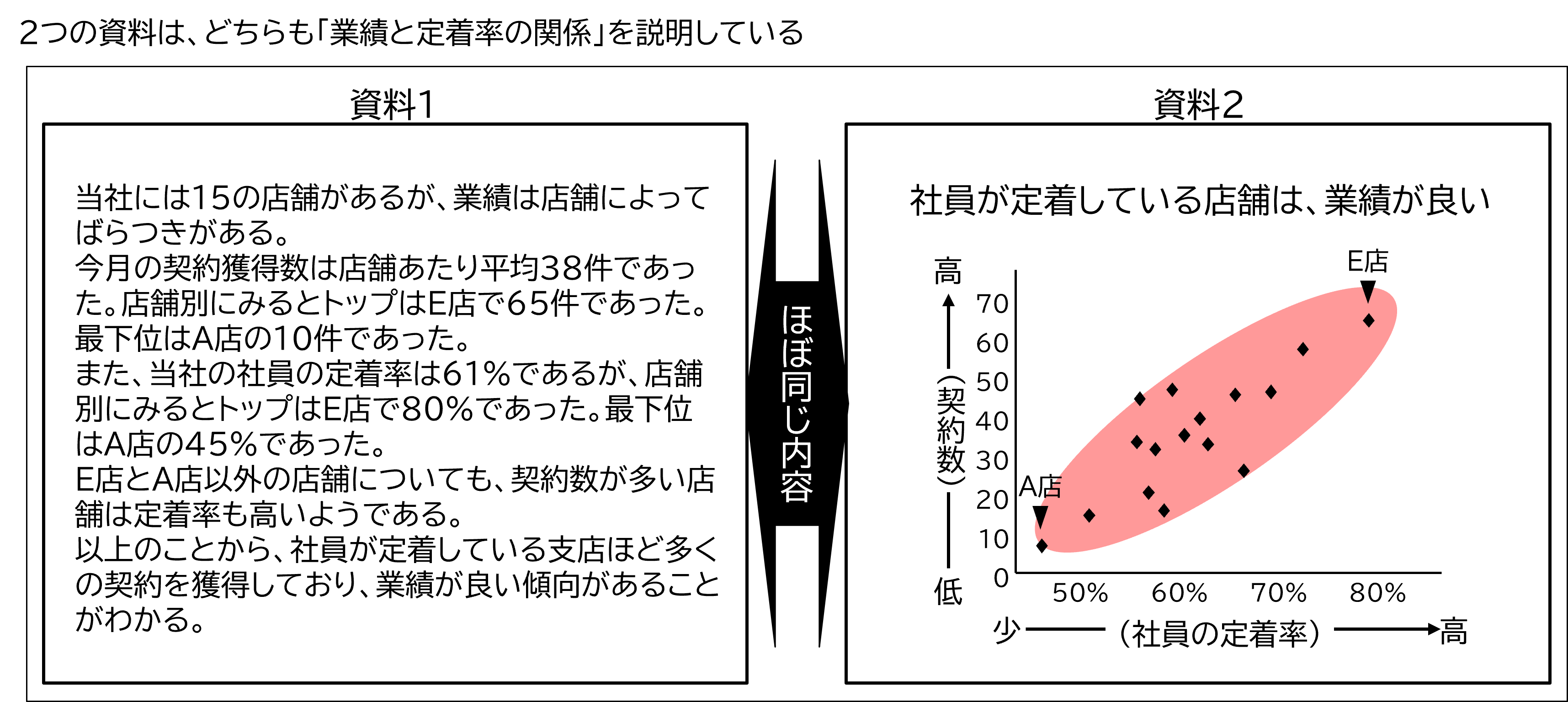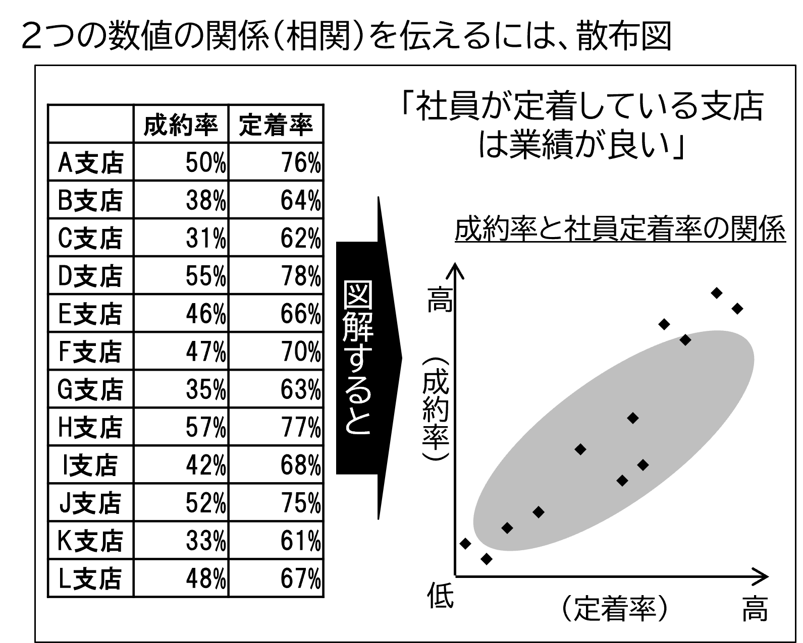 例えば下図のように、支店の業績と社員の定着率の関係を伝えたいとします。この場合、左側の表に並ぶ数字からその関係を見出すのは無理があります。右側のような散布図にして図解しましょう。