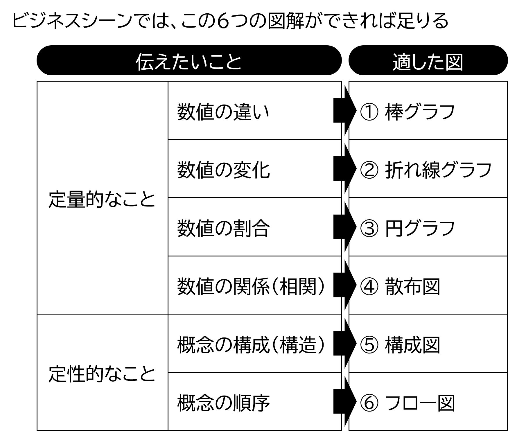 図解が求められるのは、文字や口頭で表現しにくいことを説明するときです。一般的なビジネスシーンにおいて文字や口頭で表現しにくいことには、次の6つのことが挙げられます。