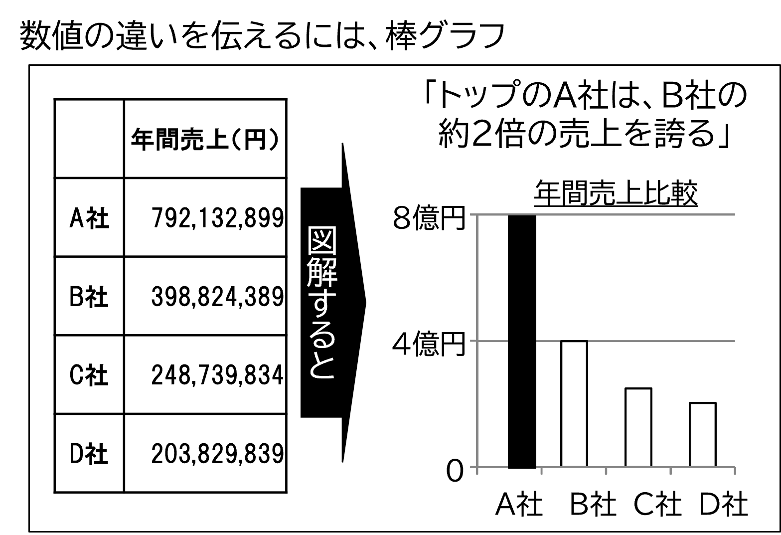 棒グラフにすると、表だけでは伝わりにくい「トップのA社はB社の約2倍の売上を誇る」ということが、簡単に伝わります。
