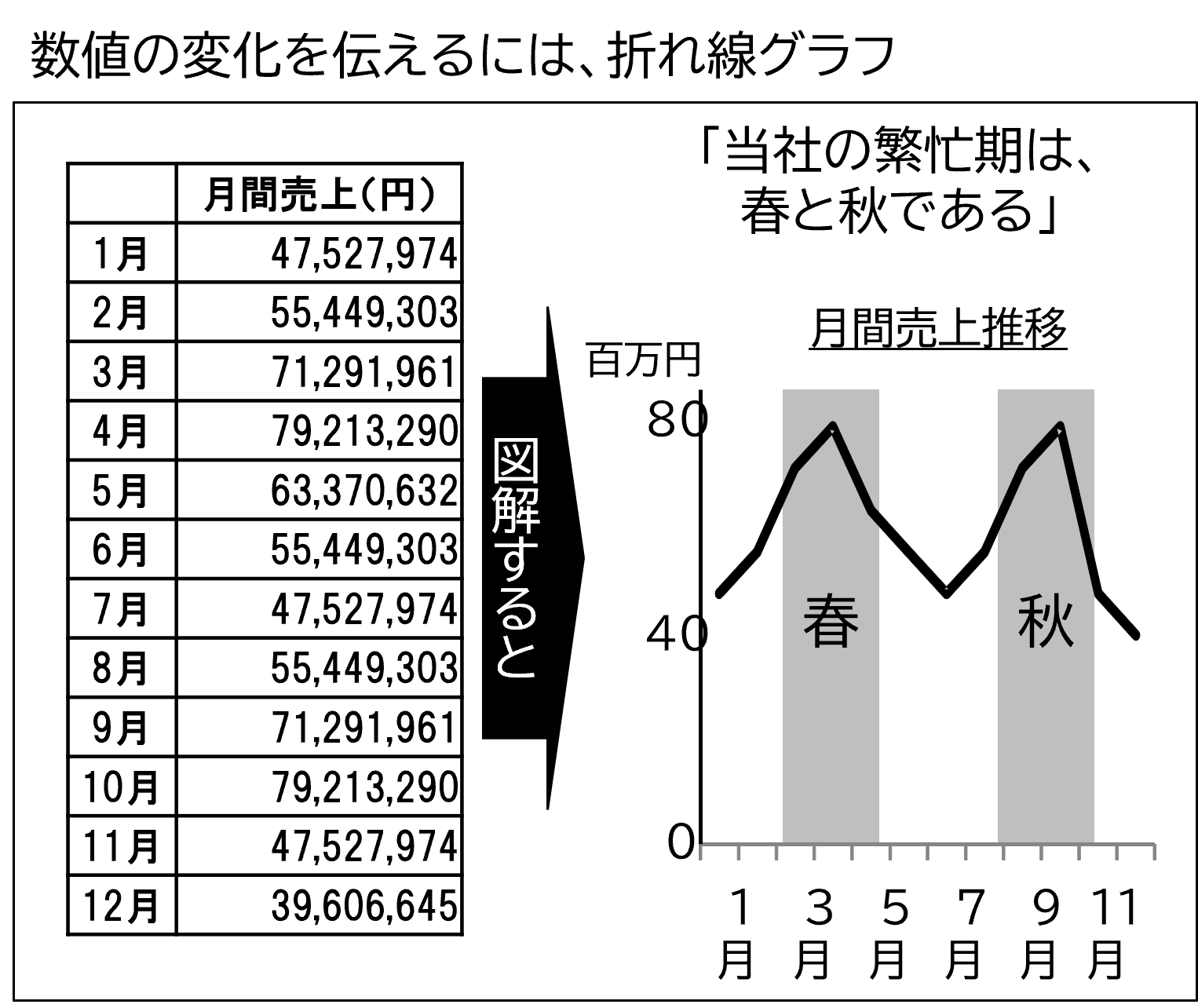 例えば下図のように、季節による売上の変化を伝えたいとします。この場合、左側の表だけで伝わるでしょうか。表には細かくて大きな数字が12個も並んでいて、数字だけで変化を読み取ることは大変です。右側のような折れ線グラフにして図解しましょう。