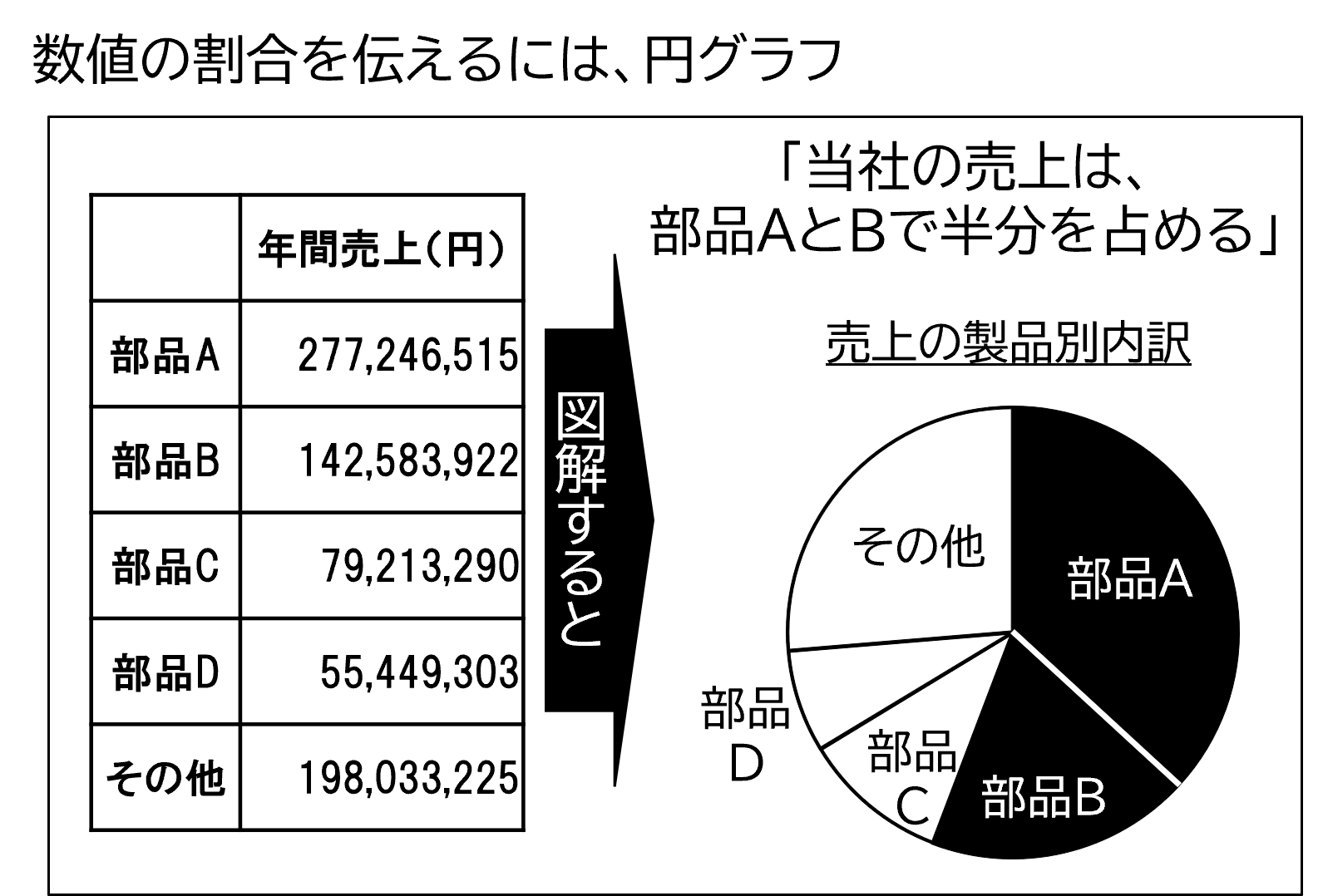 円グラフにすると、表だけでは伝わりにくい「部品AとBで売上の半分を占める」ということが、簡単に伝わります。