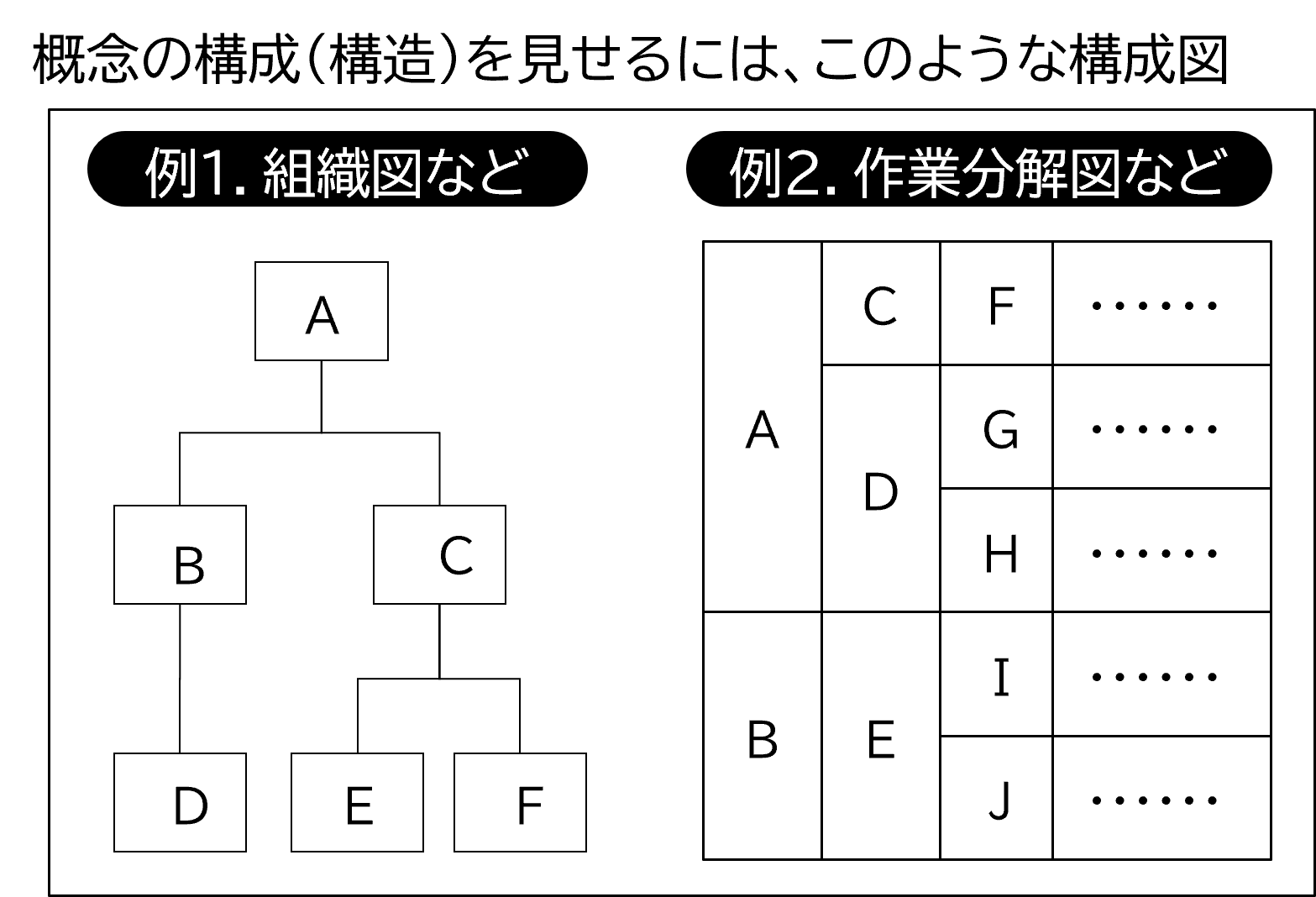 概念の「構成や構造」を伝えたい時は、構成図を使います。構成図とは、主に階層構造を図解したもので、その形状に厳密な定義はありません。