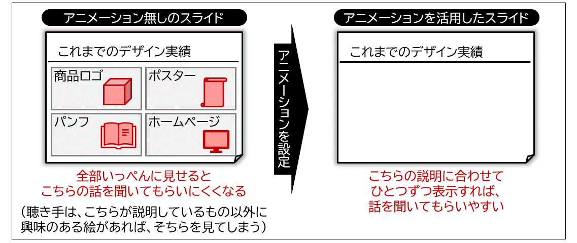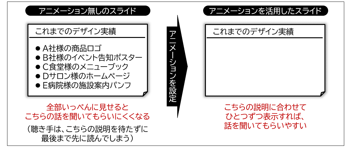 しかし、プレゼンでアニメーション機能を使う目的は、スライドを華やかにすることだけではありません。もうひとつ、「たくさんの情報を少しずつ表示することで、聴き手の理解を助ける」という目的があります。説得力あるプレゼンをするには、プレゼン資料が分かりやすいことが大前提です。アニメーション機能をうまく使うことで、プレゼンをより分かりやすいものにできます。