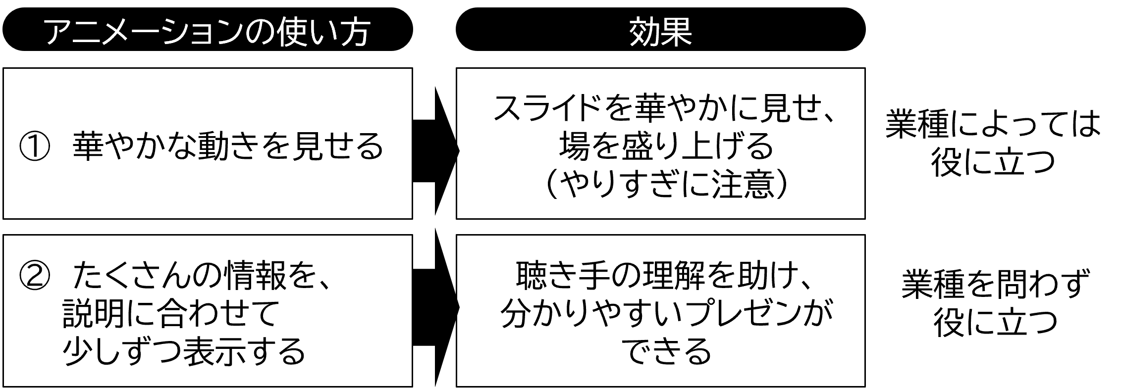 今回は、聴き手の理解を助ける目的で使うアニメーションの活用法として、以下2つを解説します。