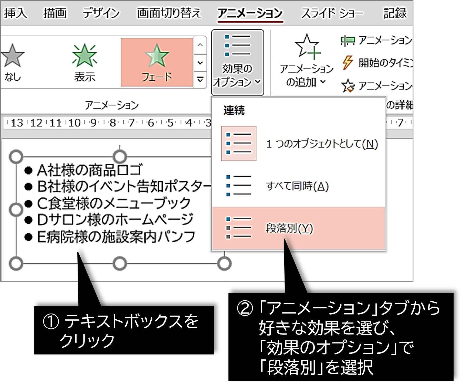 このように、箇条書きをひとつずつ表示するアニメーションを設定するには、下図のように、箇条書きのテキストボックスをクリックした状態で、「アニメーション」タブから好きな動かし方(効果)を選び、「効果のオプション」というボタンから「段落別」を選択します。