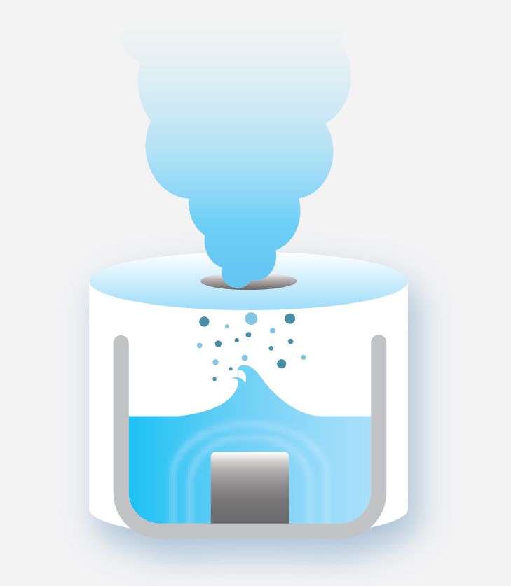 水の中に超音波で振動する素子を設置して、水を細かいミストにして放出する