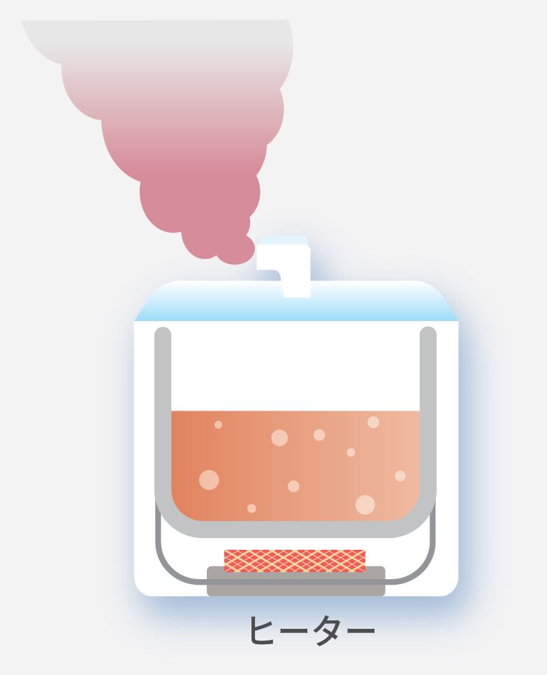 加湿器の中ではいちばん安全性の高いタイプがスチーム式です。装置の中の水を沸騰させて蒸気を作り、それを放出するので水が腐敗しづらいのが特徴です。ただし高い安全性のぶんだけ、毎回水を沸騰させるため電気代が高くなります。また蒸気の湯気が見えるので「加湿されている感」もあるので安心感があります。