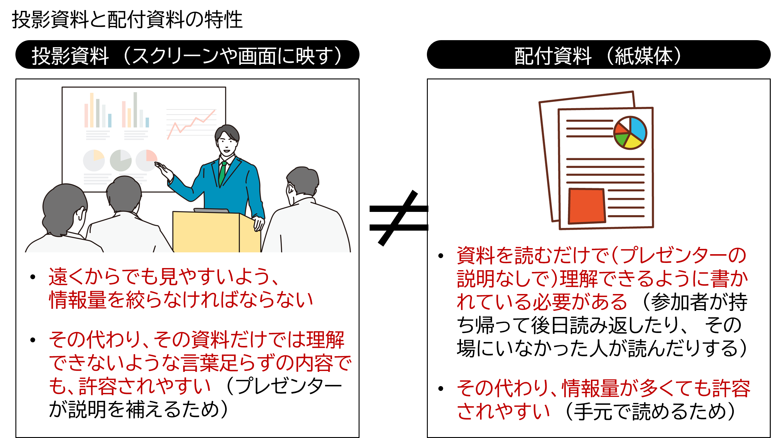 以上のように投影資料と配付資料は特性が違うので、投影に適した資料は、配付資料としては「言葉足らず」な資料になってしまいます。一方、配付に適した資料は、投影資料としては「見にくい」ものになってしまいます。