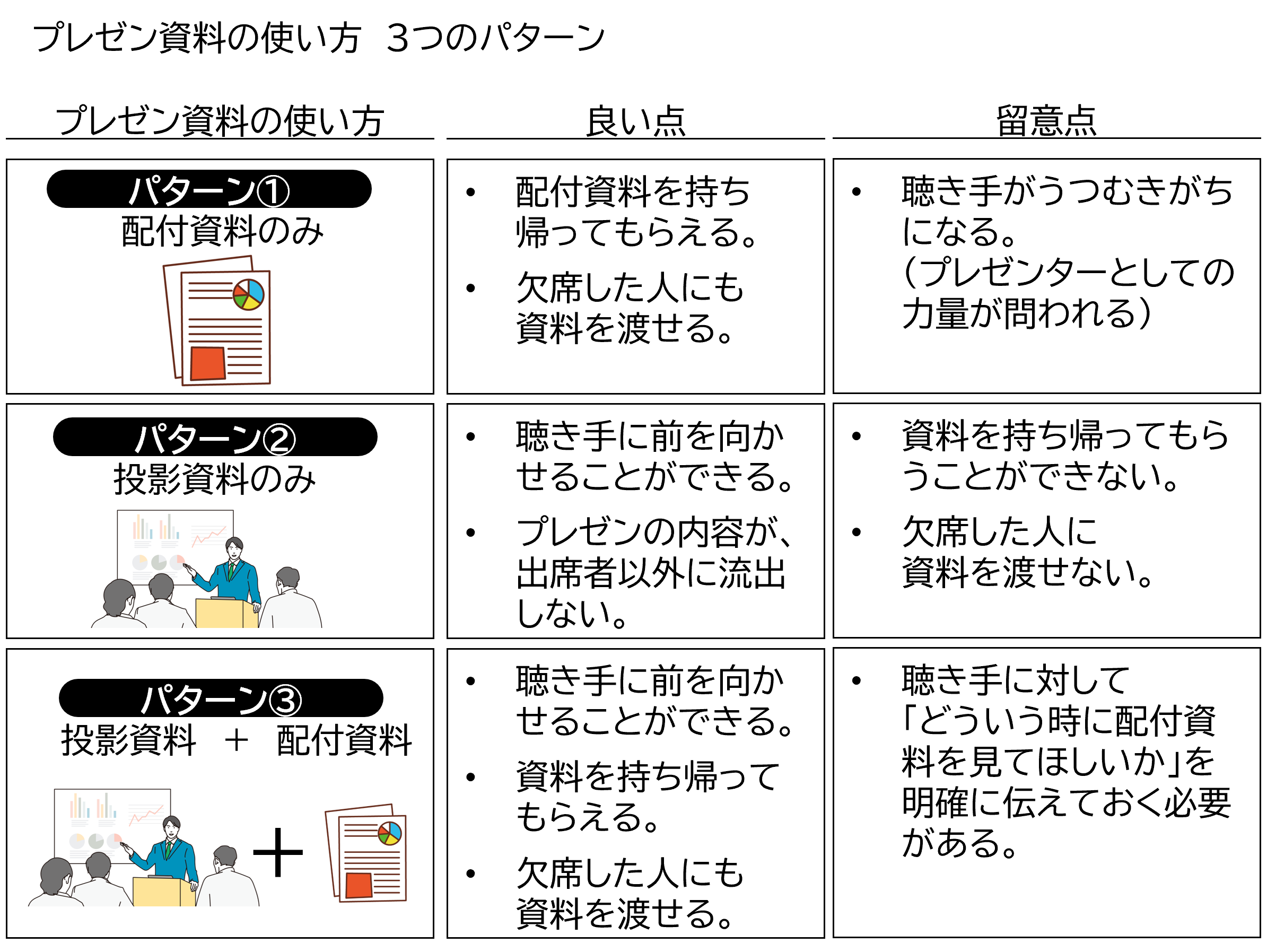 投影資料と配付資料は、必ずしも両方使えるとは限りません。プレゼン場所の制約や相手方の希望により、どちらかしか使えない場合もありますね。下図の通り、「配付資料のみ」「投影資料のみ」「投影資料と配付資料」の3パターンがあります。どのパターンのプレゼンでもベストが尽くせるように、それぞれのパターンの良い点・留意点を理解しておきましょう。