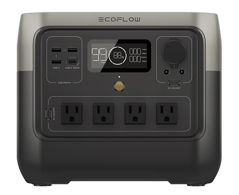 EcoFlow社のポータブル電源。どのモデルでもコンセントを差して使える。容量に応じていろいろなモデルが用意されている