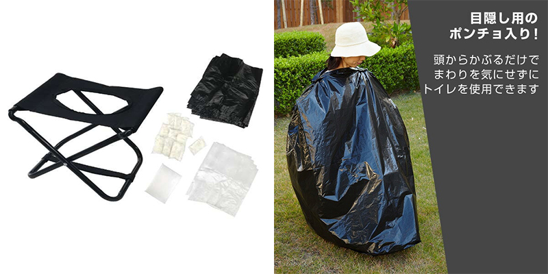 山善の防災用トイレ。非常にコンパクトで目隠し用のポンチョもよく考えられている。実際には物陰で利用すると思われるが……