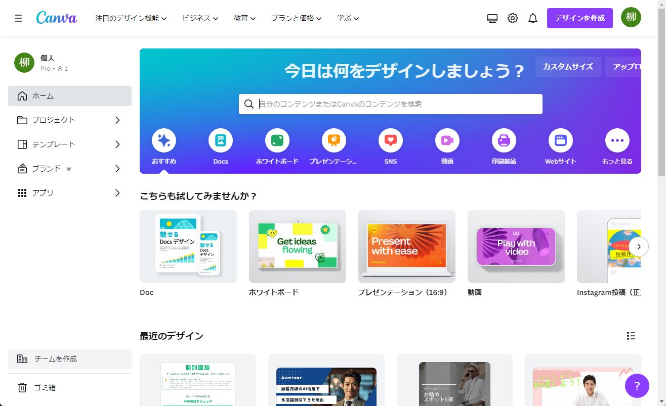 料金プランは3種類用意され、無料のCanva Freeプラン、月額1500円のCanva Proプラン、月額3000円で5名まで使えるCanva for Teamsプランから選べます。年払いにすると割引になり、それぞれ月額1000円相当、2500円相当となります。無料でも多くの機能が利用できるので、まずは試してみましょう。筆者はフリーランスなので、Canva Proプランを契約しています。