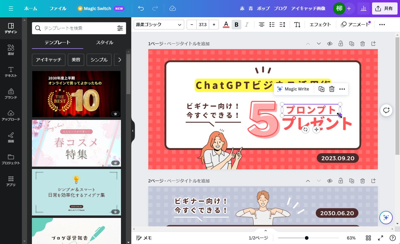 ホーム画面の検索フォームに「バナー」と入力し、バナーのテンプレート一覧を表示します。気に入ったデザインを見つけたら選択し、「このテンプレートをカスタマイズ」をクリックします。編集画面が開くので、元の文字を自由に編集しましょう。これだけで、あっという間にバナーが完成します。