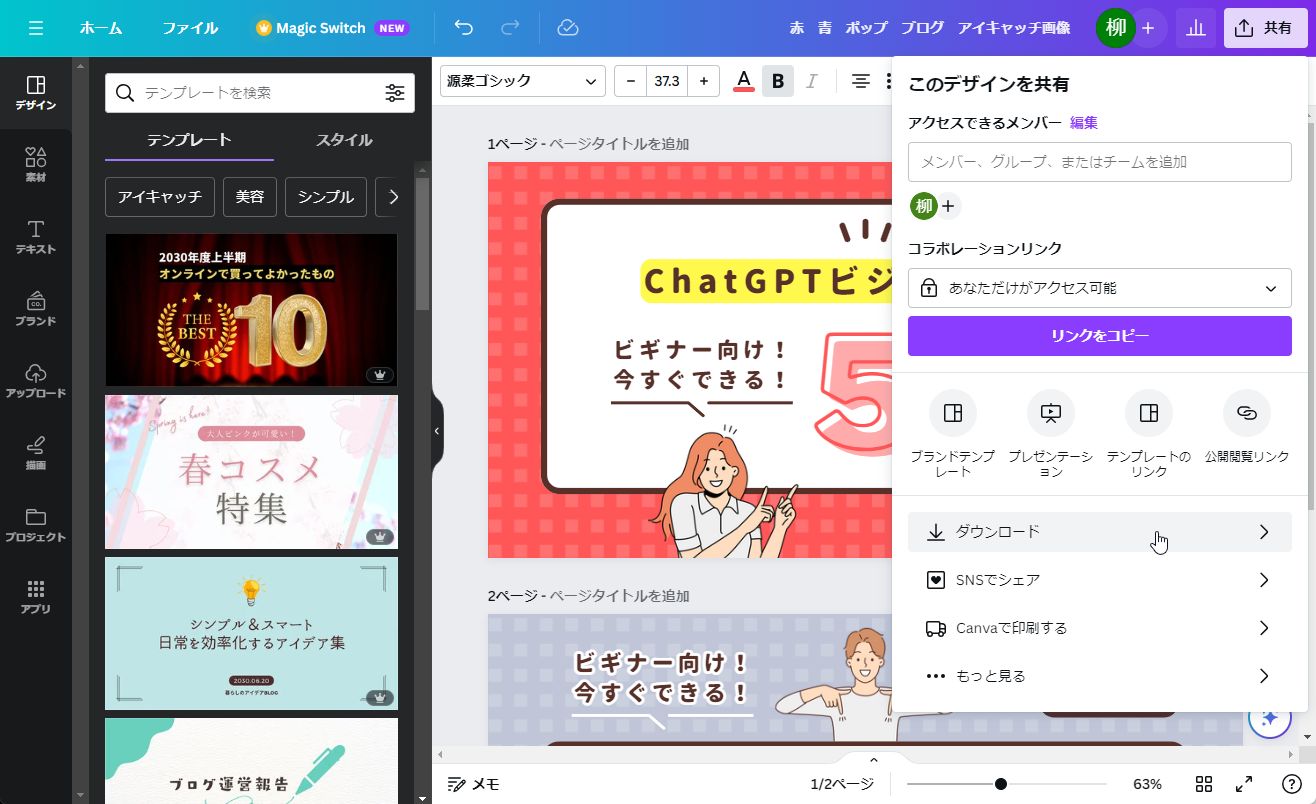 編集が終わったら「共有」をクリックし、「ダウンロード」をクリックすればファイルをダウンロードできます。Canvaメンバーにデザインを共有したり、SNSでシェアすることもできます。「Canvaで印刷する」からは、もちろん料金は発生するものの、印刷してもらうことが可能です。