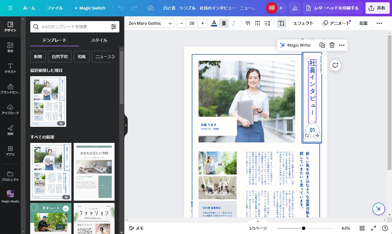 他にも様々なテンプレートが用意されています。社内報に掲載する社員インタビューなどにぴったりのテンプレートも見つかります。自分で作業していると、見出しの位置ひとつ、ちょっとした装飾ひとつを決めるのにも時間がかかってしまいますが、写真とテキストを差し替えるだけなら手間がかかりません。もちろん、不要な要素は削除できますし、手動で画像を増やすなどレイアウト変更することも可能です。