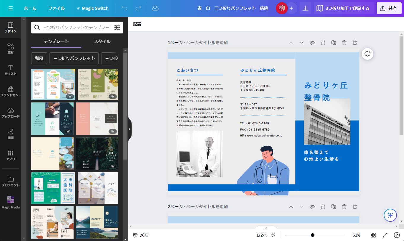A4の紙を4つ折りにするパンフレットのテンプレートもあります。素人だと、どこで折るようにすればいいのかわかりませんが、テンプレートを元にすれば安心です。