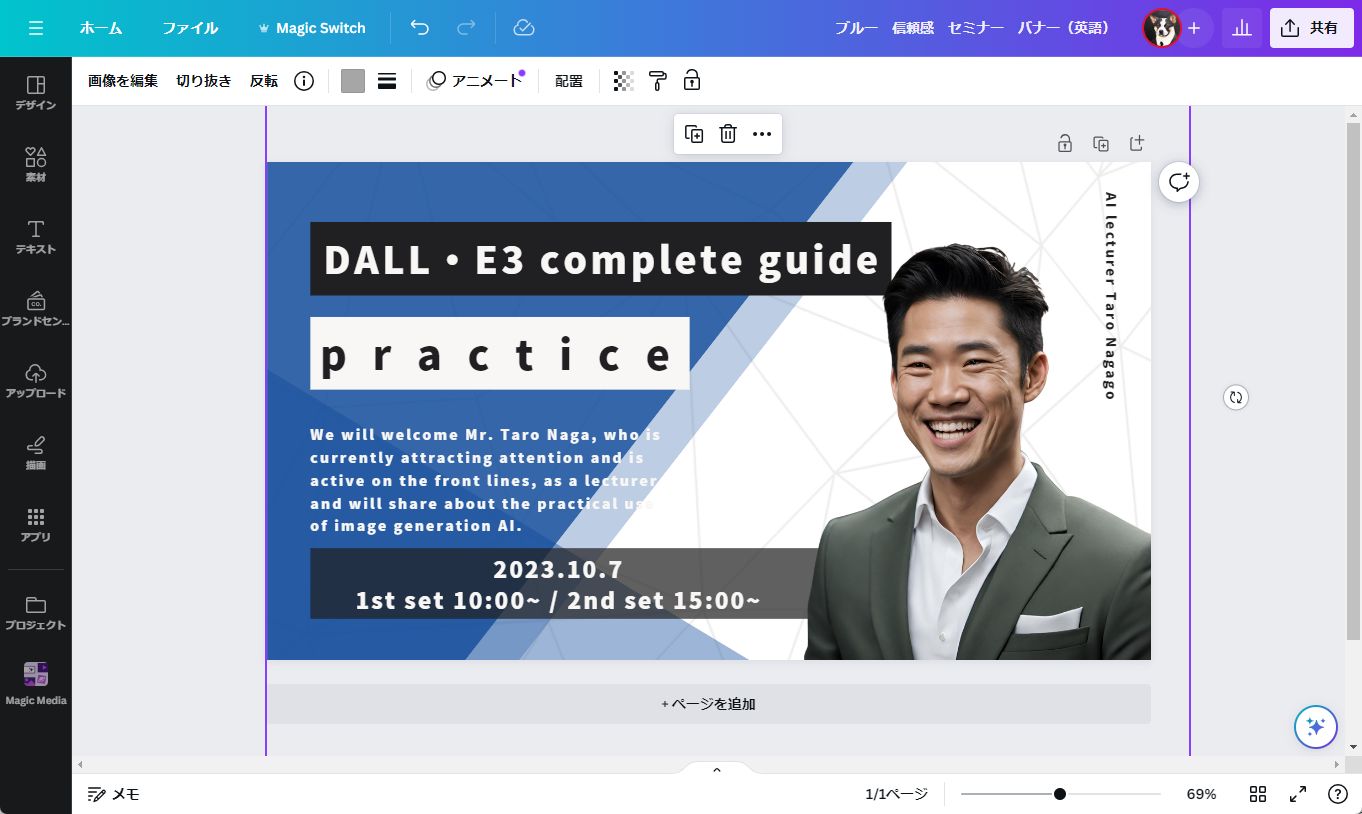 デザインはともかく、写真はありものを使いにくい、というケースもあるでしょう。例えば、AI講師というイメージ画像が欲しい場合、「Text to Image」機能で作成してしまいましょう。「スーツを着たアジア人のビジネスマンが語っている」といったプロンプトを入力するとAIが画像を生成してくれるのです。