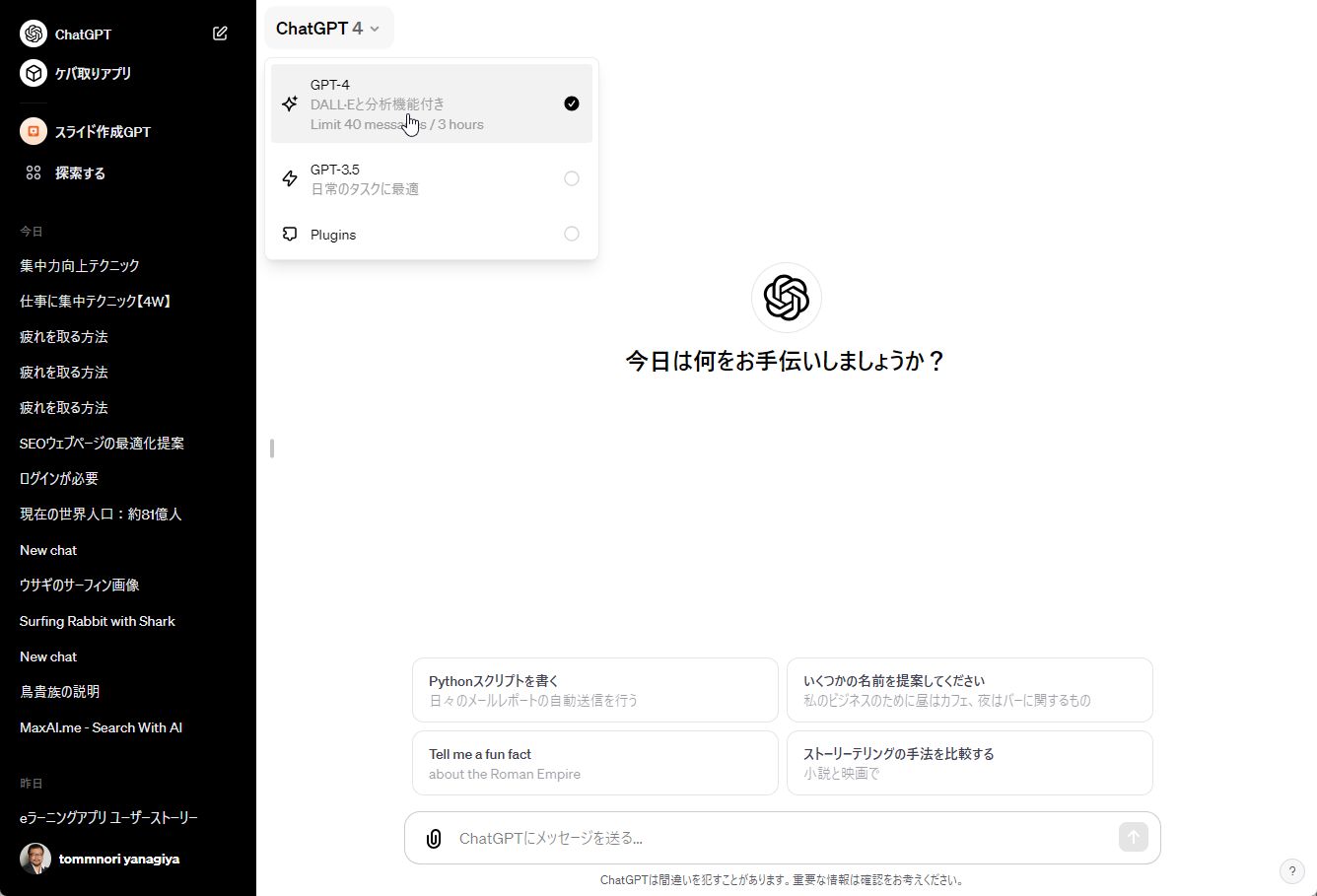 まずは、画面構成をチェックしてみましょう。以前は中央上部にあったGPTの選択スイッチは左上のプルダウンメニューになりました。さらに、高度なデータ分析やブラウジングなどの機能が、「GPT-4」にまとめられました。つまり、メニューを切り替えなくても、プロンプトで「データ分析をしてください」とか「●●をウェブで調べてください」などと指示するだけで動作するのです。そのため、GPT-4を選択すると、プロンプト欄にファイルをアップロードするアイコンが追加されています。