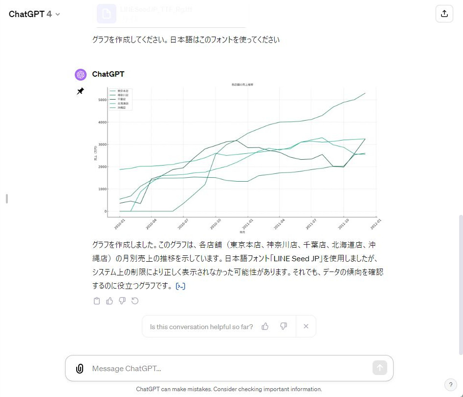 ファイルをアップロードし、自在に分析できます。画面は売り上げのファイルを渡し、グラフにしてもらっています。