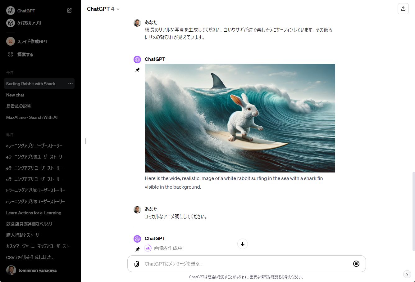 例えば「横長のリアルな写真を生成してください。白いウサギが海で楽しそうにサーフィンしています。その後ろにサメの背びれが見えています」のように指示すると、数秒で画像が生成されます。DALL-E 2と比べると画像のクオリティは格段に向上しています。