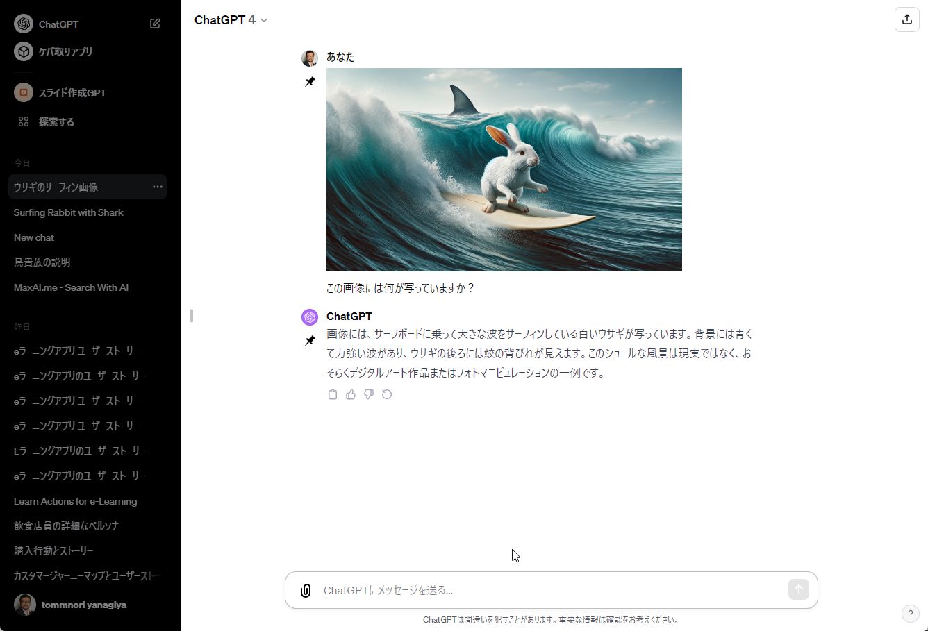 ChatGPTはマルチモーダルに対応しました。画像をアップロードし、その中に写っている内容に対して質問したりできるのです。先ほど作成した画像をアップロードして、何が写っているか聞いたところ、