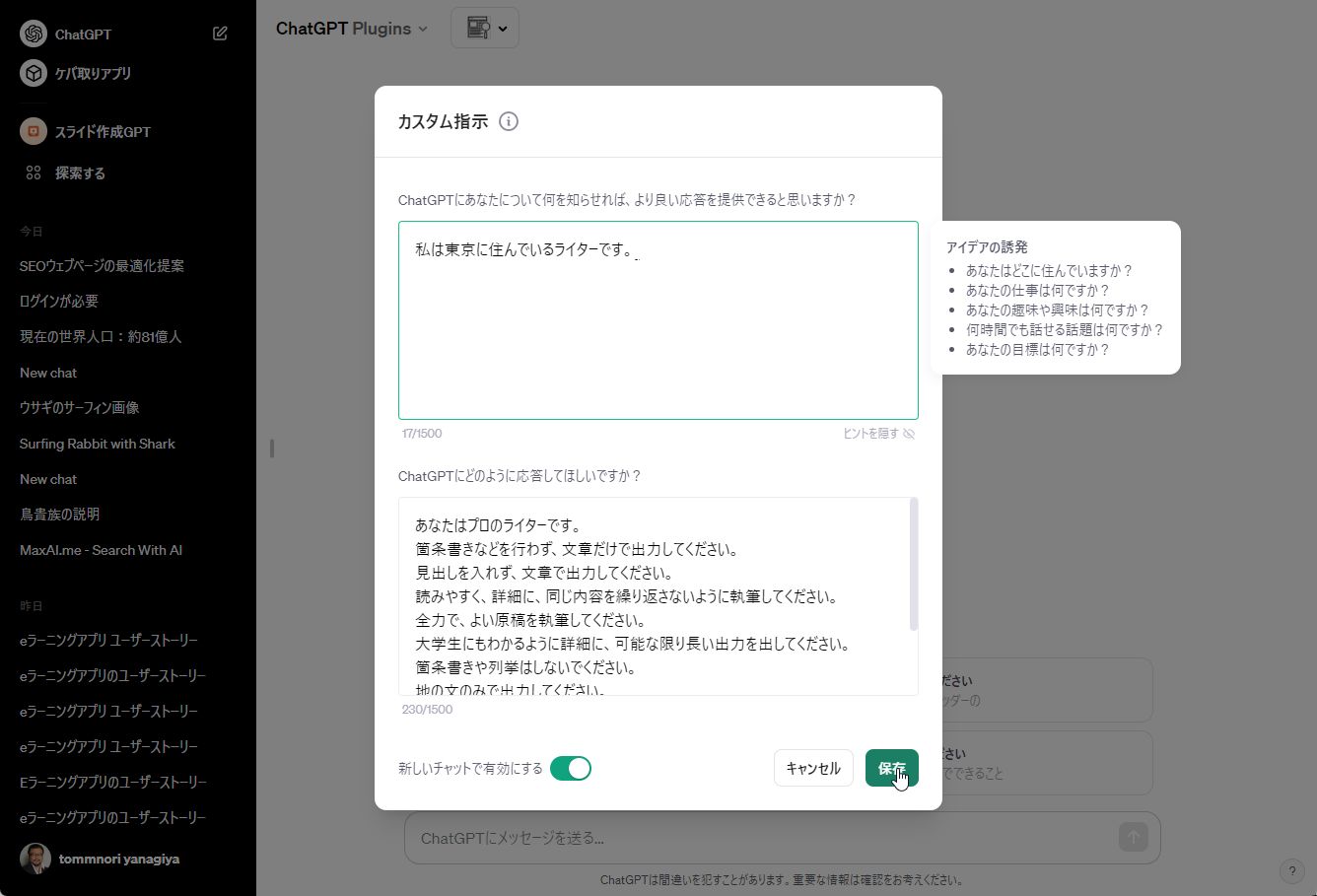 「カスタム指示」も有料プラン向けの機能でしたが、現在は無料プランでも利用できるようになっています。メニューから「カスタム指示」を開くと、プロンプトを設定できます。通常のプロンプトに入力してもいいのですが、毎回入力するようなプロンプトがあるなら、ここで設定しておくと手間が省けます。
