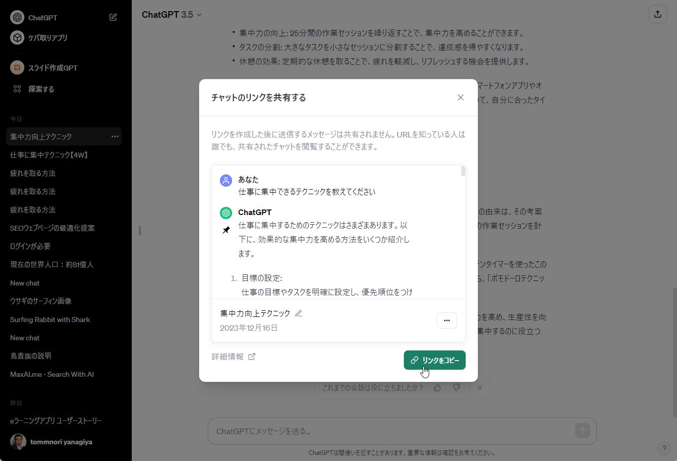 そんな時は、ChatGPTの右上の共有アイコンをクリックし、チャットごと共有してしまいましょう。ChatGPTではなくオリジナルの画面でチャットを共有できます。現在のところは、DALL-E 3の画像は共有できません。