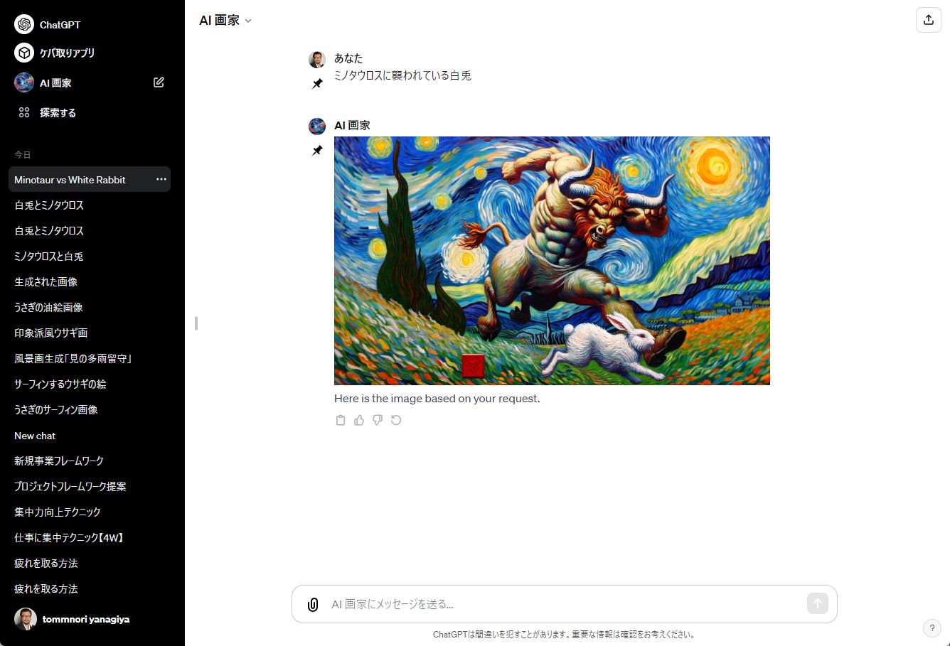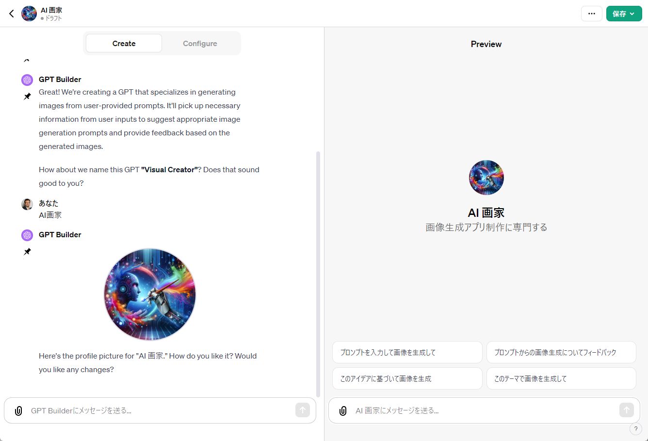 すでに、多くの人が作った「GPTs」が公開されています。試しに、筆者が5分で作ってみました。入力されたものをテーマに画像を生成します。その際、ゴッホ調の油絵にしたうえ、署名を入れる、といった処理をしています。