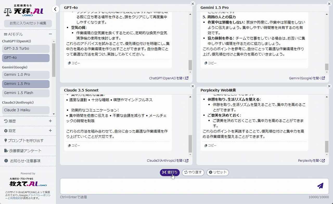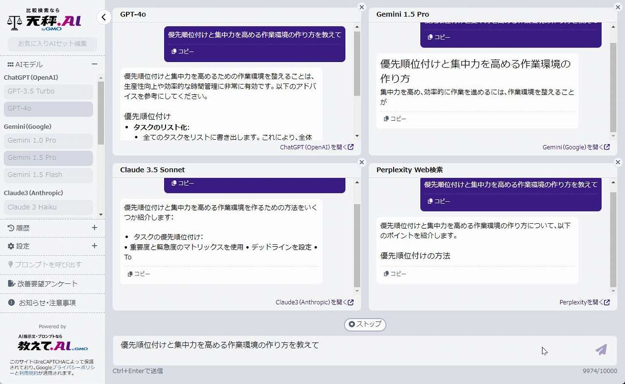 試しに「優先順位付けと集中力を高める作業環境の作り方を教えて」と入力してみました。各AIモデルが出力を開始します。各モデルの特徴が出ていて、AIの勉強にもなります。下位のAIモデルを並べて出力させると、どんな違いがあるのかが一目瞭然です。
