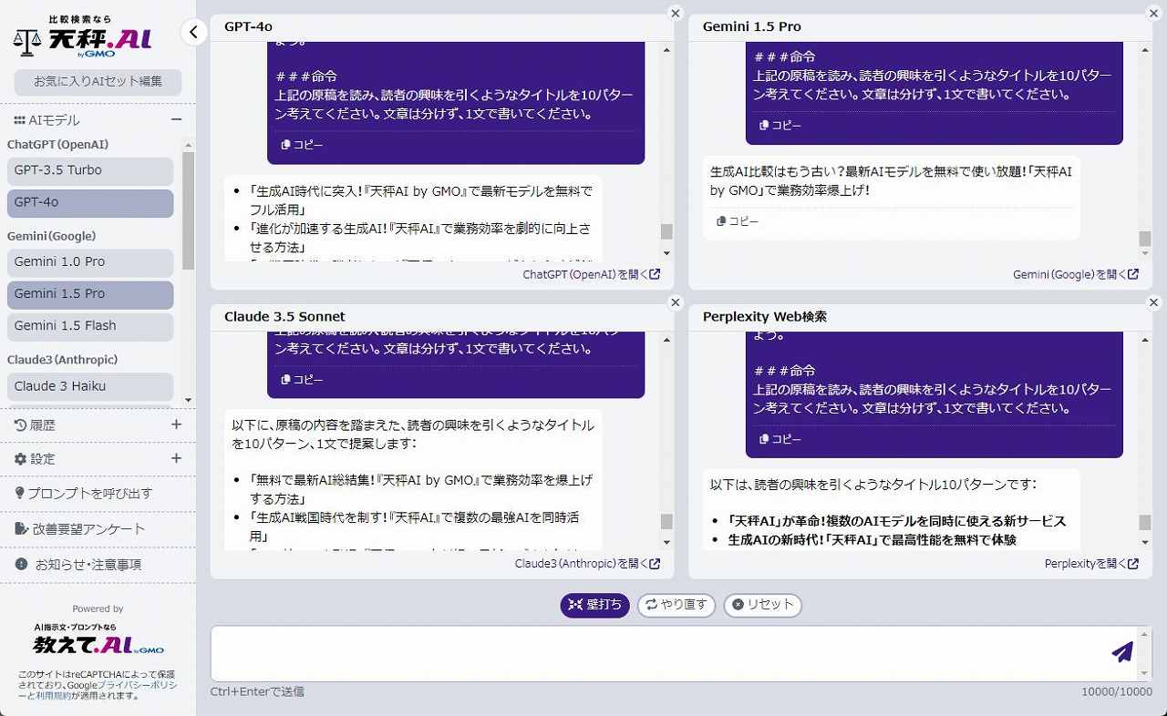 筆者はすべてのサービスを契約しているので、似たことはできます。しかし、ウェブページを切り替えて何度もコピー&ペーストを繰り返さずとも、一発で複数のAIモデルに出力させられるのはとても便利です。