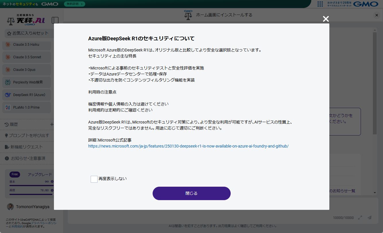 複数のAIモデルを無料で利用できる「天秤AI」でAzure版DeepSeek-R1も利用できます。
