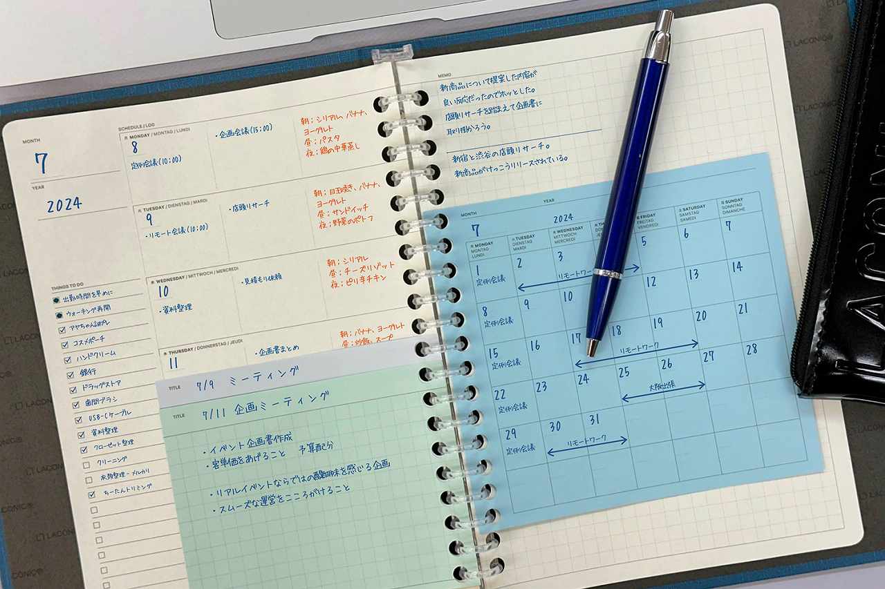 月間カレンダーで予定を見ながら週間のメモがとれる