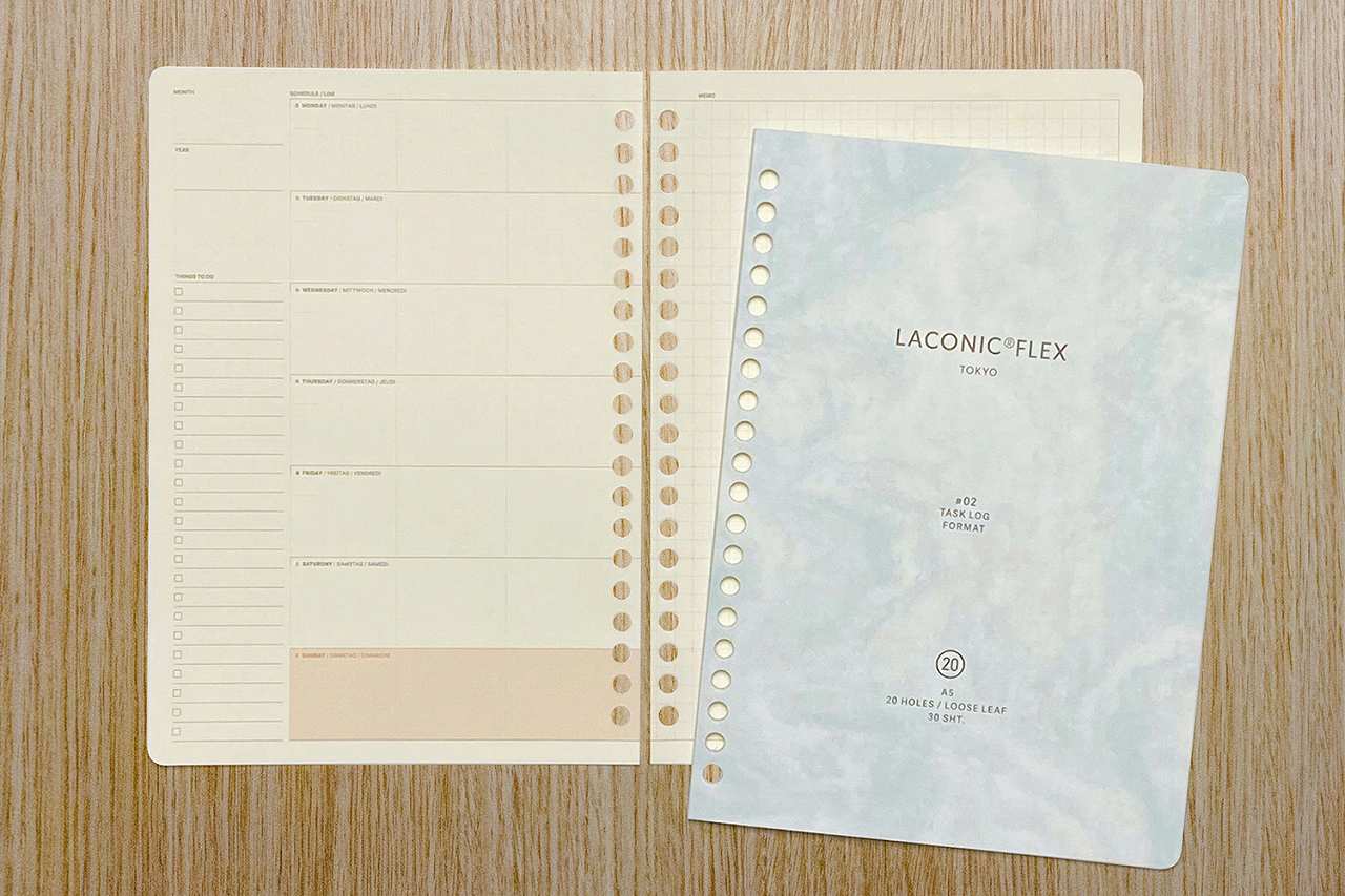 LACONICの「FLEX(フレックス)」は、見開いたページ上にコンテンツを重ね合わせて使うことで、 様々な情報がページを行き来することなく把握できる、新感覚のルーズリーフです。ルーズリーフには、コンパクトなものや縦長のものなど大小さまざまなサイズがあるので、組み合わせて使うことでページを開いただけで、様々な情報をすぐに確認することができます。