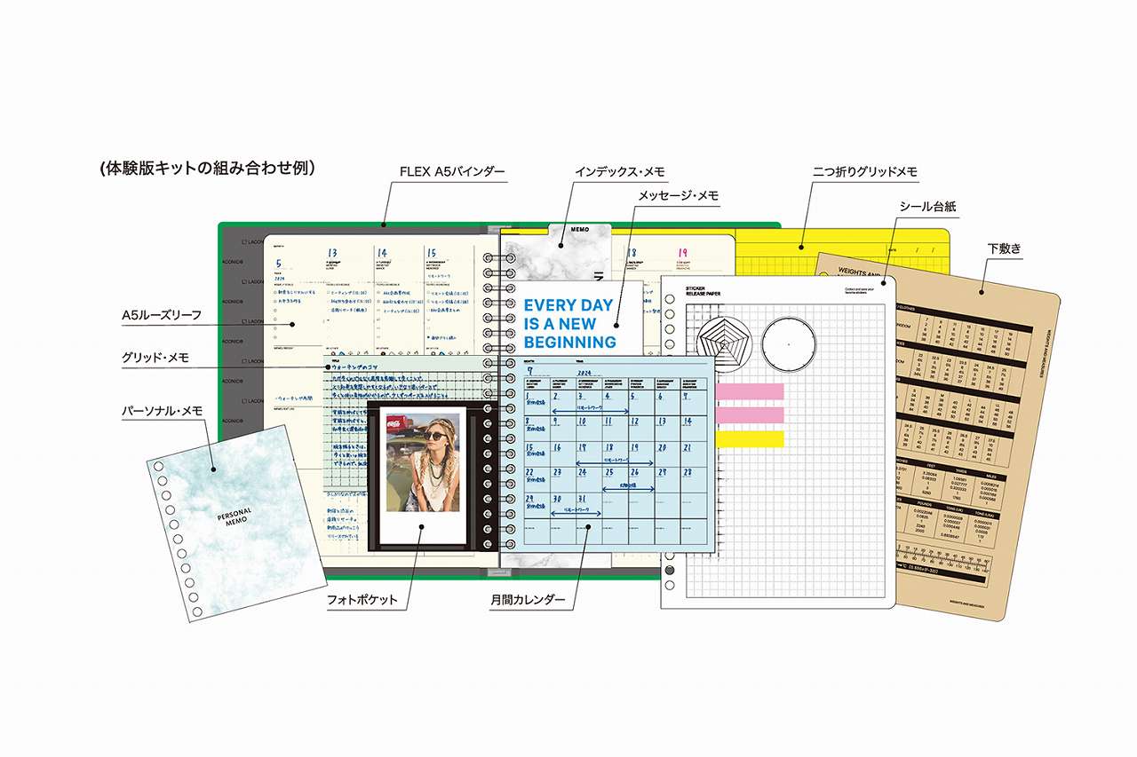「FLEX(フレックス)」は、バインダーとリフィルを組み合わせて使います。ルーズリーフが5種類、エレメンツが8種類あり、どれを使っていいか迷ってしまう場合は、各種リフィルが数枚ずつ入った「FLEX 体験版キット」もあります。色々なリフィルを試して使ってみてから、気に入ったものを買い足して使うこともできるので、とりあえず使って見たい方は「FLEX 体験版キット」がおすすめです。